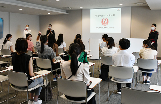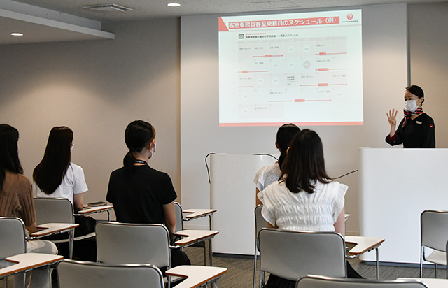 座学では、講師役の客室乗務員が業務内容を説明。「保安要員」と「サービス要員」を兼ねていることや、出社から乗務、帰着までの一連の流れなどを説明した。参加した学生はJALを選んだ理由などを質問。講師役の客室乗務員は「雰囲気が良さそうだった。入社後もギャップがなかった」と答えていた。