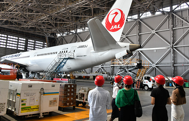 今回のプログラム「JAL 空育JOB」は格納庫見学が60分、仕事体験の座学と実体験が30分ずつの計2時間。参加した30人は7-8人ずつの4グループに分かれ、見学と仕事体験を進めた。プログラム中は一般の入場者はおらず、参加者で貸し切った。
