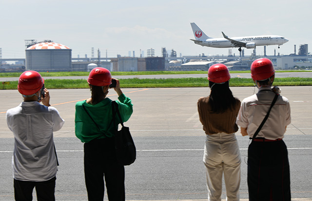 JALの格納庫から羽田空港A滑走路に着陸する機体をを見学する参加者=22年8月17日 PHOTO: Yusuke KOHASE/Aviation Wire