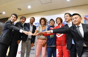 2017年に日本で24年ぶりに開催されたウインドサーフィンワールドカップ横須賀大会成功に向け手を合わせる(左から)吉田市長、ディアス会長、イアチーノ選手、オブリンガ選手、国枝選手、須長選手、ANAの平子社長、藤本機長(肩書きはいずれも当時)=17年5月10日 PHOTO: Tadayuki YOSHIKAWA/Aviation Wire