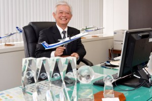 ボンバルディアから贈られた6つの定時性表彰トロフィーとQ400の模型を手にするANAウイングスの泉社長=13年8月 PHOTO: Tadayuki YOSHIKAWA/Aviation Wire