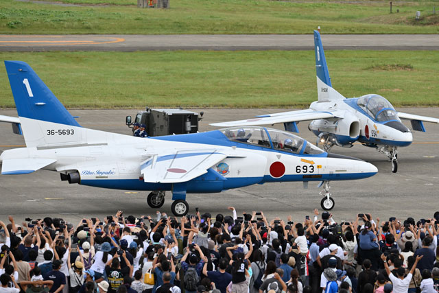 小松基地航空祭で曲技飛行を終えて駐機場へ向かうブルーインパルスのT-4=22年9月19日 PHOTO: Tadayuki YOSHIKAWA/Aviation Wire