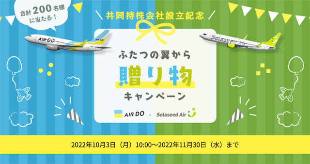 10月に共同持株会社を設立するエア・ドゥ(ADO/HD)とソラシドエア(SNJ/6J)は9月26日、航空券やオリジナルグッズなどを抽選でプレゼントするキャンペーンを、持株会社化する10月3日から始めると発表した。また、3日は羽田空港で記念式典を開き、記念品などを用意する。
