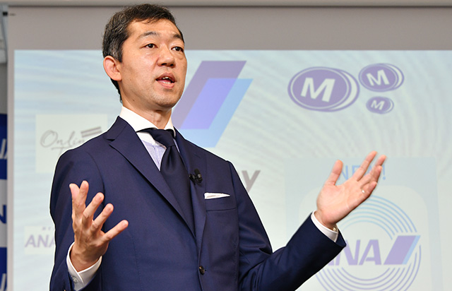 リニューアルしたANAマイレージクラブアプリを紹介するANA Xの轟木社長=22年10月20日 PHOTO: Yusuke KOHASE/Aviation Wire