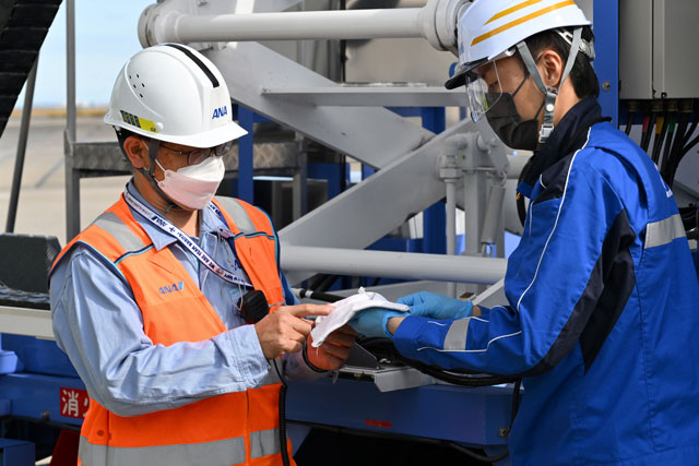羽田空港で給油する燃料点検するANAの整備士(左)=22年11月14日 PHOTO: Tadayuki YOSHIKAWA/Aviation Wire