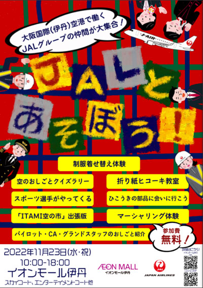 伊丹空港を拠点とするJALグループ各社とJAL西日本支社、イオンモール伊丹の共催で、子供向け制服の試着やクイズラリー、折り紙ヒコーキ教室、マーシャリング体験などを行い、JALアスリート社員によるステージイベントも行う。