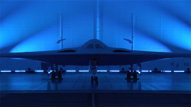 パームデールでお披露目されたステルス戦略爆撃機B-21「レイダー」(ノースロップ・グラマンのライブ配信から)