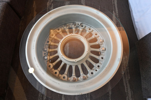 東京ベイ東急ホテルのコンセプトルーム「JAL 787 10th Anniversary Room」に設置されたホイールテーブル=22年12月2日 PHOTO: Tadayuki YOSHIKAWA/Aviation Wire
