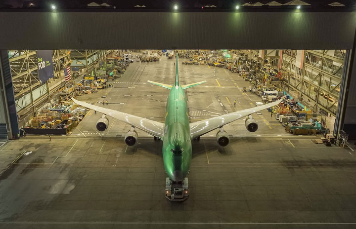 ボーイングのエバレット工場でロールアウトする最後のジャンボ機となるアトラスエアー向け747-8F貨物機(ボーイング提供)