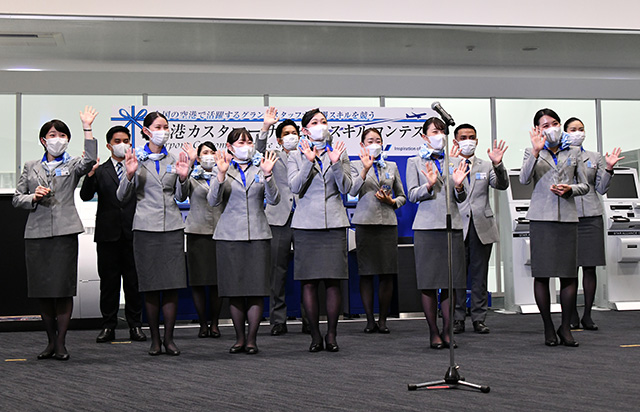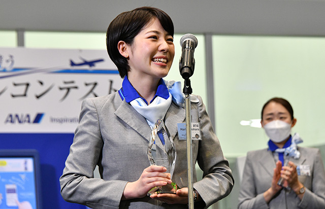 グランプリを獲得した野原さんは「本当にうれしい。あっという間に終わった本番を通じ、たくさんのお客さまを接遇できる喜びを感じた」と喜びをあらわにした一方「お客さまとの出会いは一期一会。ANAの印象の一端を担っている責任を持って頑張っていきたい」と話し、気を引き締めた。