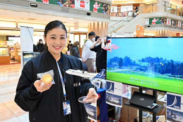 羽田空港でATR72の模型と佐渡バタークッキーを手にPRするトキエアの社員=22年12月24日 PHOTO: Tadayuki YOSHIKAWA/Aviation Wire