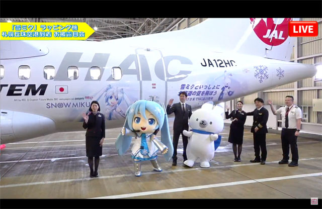 丘珠空港に到着した「雪ミク」を描いたHACのラッピング機(ピアプロTVのライブ配信から)
