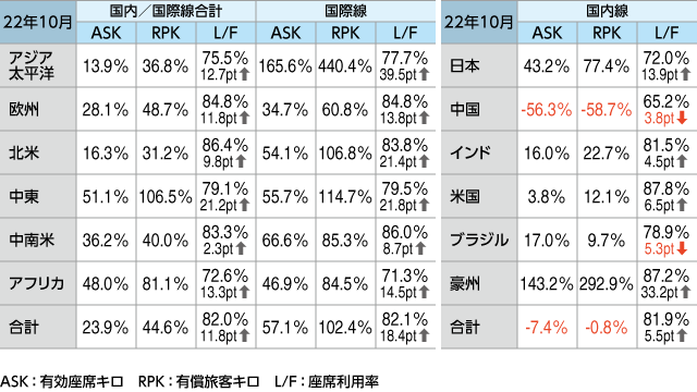 IATA(国際航空運送協会)の2022年10月世界旅客輸送実績によると、国際線と国内線の合計は、座席供給量を示すASK(有効座席キロ)が前年同月比23.9%増(19年同月比25.7%減)、有償旅客の輸送距離を示すRPK(有償旅客キロ)が44.6%増(25.8%減)となった。ロードファクター(座席利用率、L/F)は11.8ポイント上昇(0.1ポイント低下)の82.0%だった。新型コロナ前と比べると7割以上の回復を継続し、10月も全体では安定した数値で推移したものの、中国政府によるゼロコロナ政策が国内線を中心に数値を押し下げた。