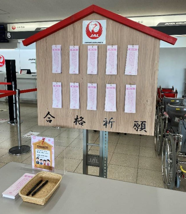 日本航空(JAL/JL、9201)は、学問の神様として名高い太宰府天満宮(福岡県)の絵馬を鹿児島空港に設置している。1月31日までで、JALの整備士が廃材を再利用して手作りした。