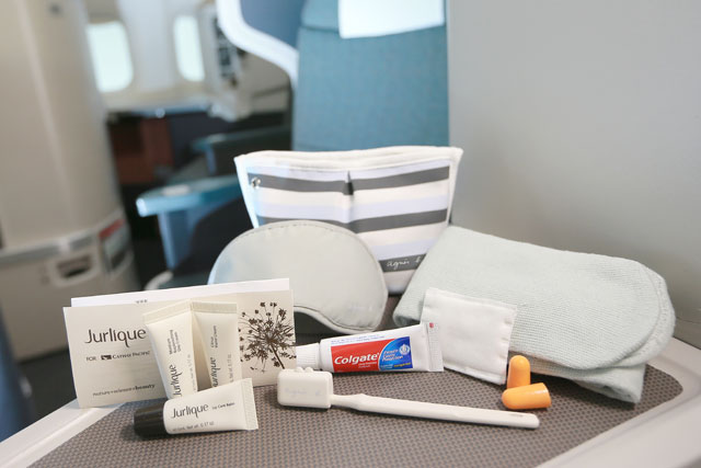 新アメニティーキットには、2007年から提携しているアニエス・べーによるオリジナルデザインのケースを使用。 デイクリームなどのジュリークの製品以外に、靴下やアイマスク、耳栓、歯磨きセットを用意した。