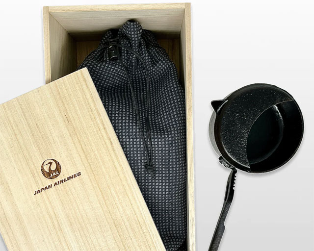商品には廃棄予定だった未使用の航空機の座席生地を使った巾着が付属し、JALのロゴがレーザープリントされたオリジナルの木箱に入れて届ける。