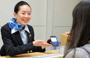 スマートフォンを手に案内するANAエアポートサービスの大上さん=13年9月 PHOTO: Tadayuki YOSHIKAWA/Aviation Wire