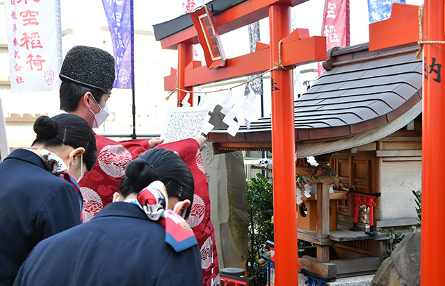 穴守稲荷神社での航空稲荷月次祭に参列するJALスカイの地上係員(手前2人)=23年2月17日 PHOTO: Yusuke KOHASE/Aviation Wire