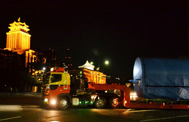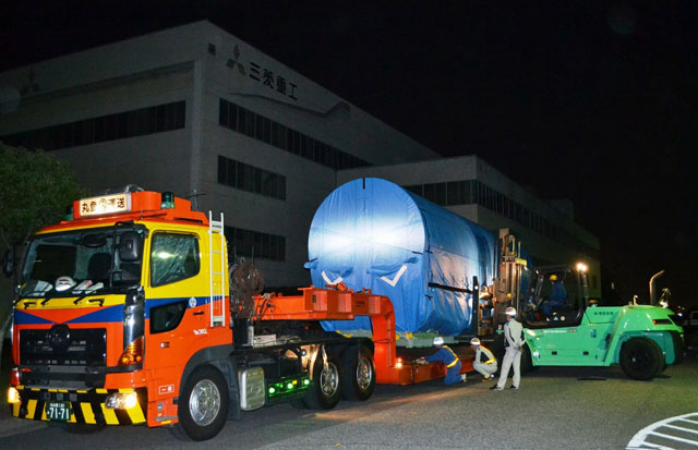 飛島工場を出発するMRJの胴体=10月12日、三菱航空機提供