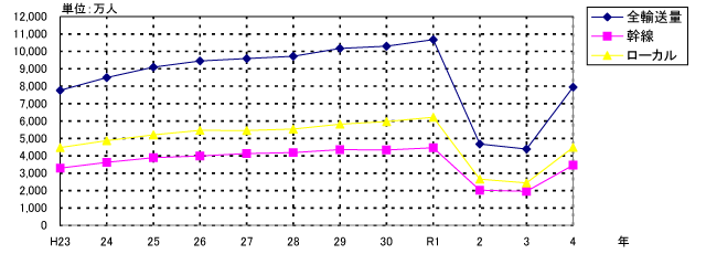 2011年(平成23年)から22年(令和4年)までの国内線旅客数の推移(国交省航空輸送統計から)