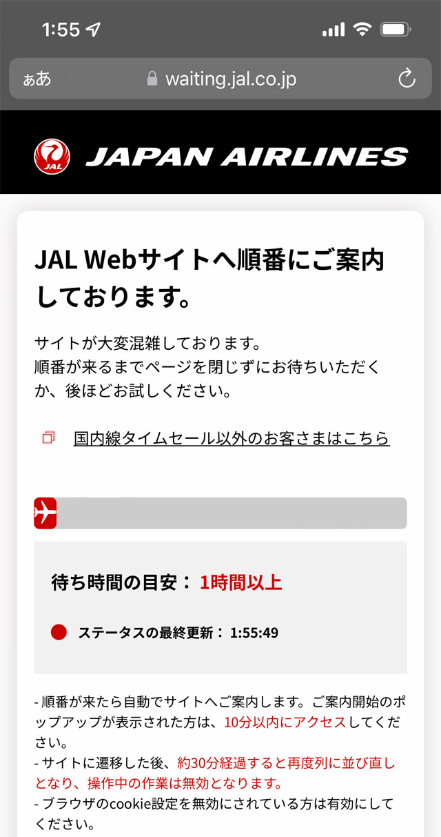 タイムセールによるアクセス集中時に「仮想待合室」を設けたJAL=23年3月31日午前1時55分 PHOTO: Tadayuki YOSHIKAWA/Aviation Wire