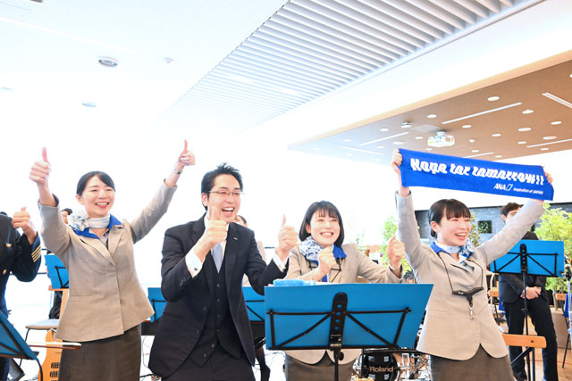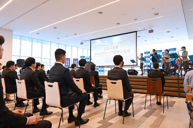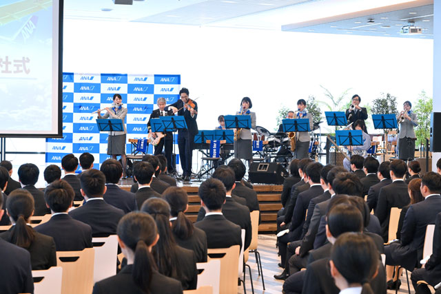 メイン会場では、社員による「ANA Team HND Orchestra(ANAチーム羽田オーケストラ)」が演奏を披露。緊張気味の新入社員たちを温かく迎えた。