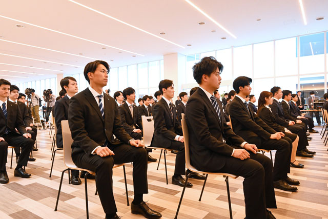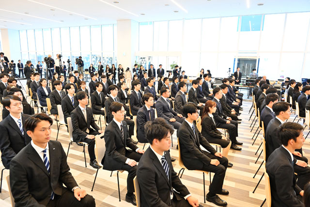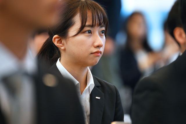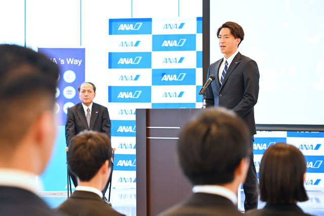 新入社員を代表してあいさつした山口さんは、コロナで大学に行けない時期ができたことで、「移動」が自分にとってどういう存在かを考え、入社に至ったという。「飛行機に乗る移動は距離の長い移動をイメージされると思う。日常生活でどれだけ飛行機のタッチポイントを増やしていけるか、といった仕事が総合職はできると考えているので一生懸命取り組みたい」と話した。