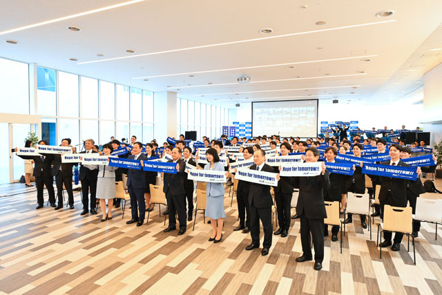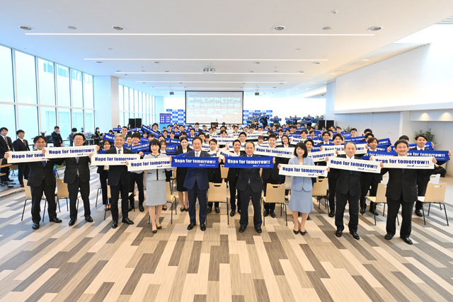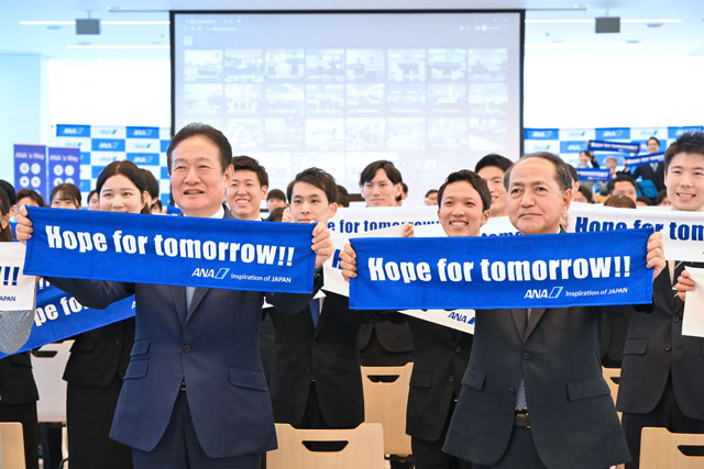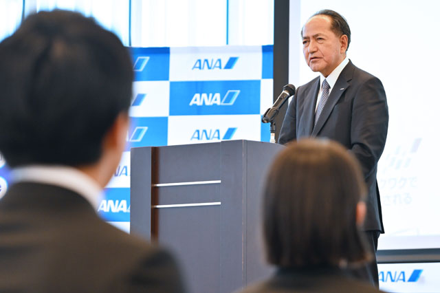 ANAHDの芝田浩二社長は「この3年間で世の中は大きく変わった。皆さんもそれぞれの立場でさまざまな苦労や経験をなさったと思う。ANAグループにとっても厳しい3年間だったが、全社一丸となって乗り越える原動力となったのは、創業から70年間に渡り受け継いできた不屈の精神と、自分たちの力で新しい時代を作る信念だった」とあいさつ。