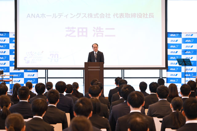 ANAグループの入社式であいさつするANAHDの芝田社長=23年4月1日 PHOTO: Tadayuki YOSHIKAWA/Aviation Wire