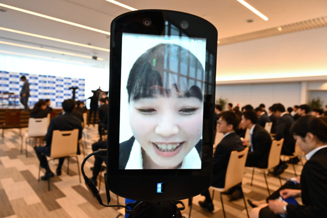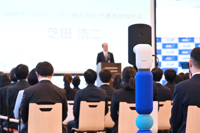 ANAグループの入社式は例年羽田空港の格納庫で実施しているが、今回はABBのメイン会場にANAの新入社員91人に列席し、グループ33社の975人は自社の会議室などからオンライン参加するハイブリッド開催とした。また、グループ会社のavatarin(アバターイン)が手掛ける遠隔操作ロボット「newme(ニューミー)」を使った“出席”もあった。
