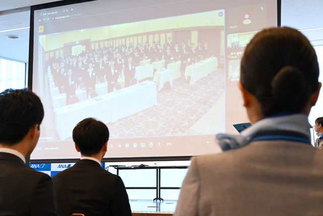 オンラインとのハイブリッド開催となったANAグループの入社式=23年4月1日 PHOTO: Tadayuki YOSHIKAWA/Aviation Wire