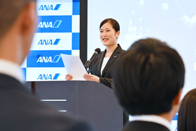 ANAにパイロット訓練生として入社した井上柚乃さんは「パイロットはお客様との接点が少ないが、機内アナウンスなどを通じて、安心して乗っていただける、信頼されるパイロットになりたい」と抱負を述べた。