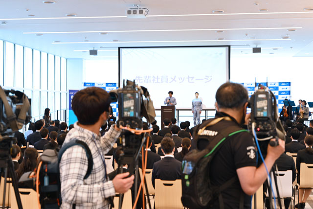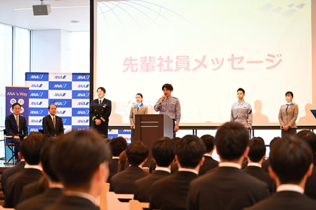 新入社員代表あいさつは、ANAのグローバルスタッフ職の山口泰和さん、ANAエアポートサービスの村山芽美さん、ANAシステムズの武井柾憲さんの3人が行い、制服を着用したパイロット、客室乗務員、整備士、地上旅客係員、グランドハンドリングの先輩社員が入社を歓迎。先輩を代表し、グランドハンドリングの小嶋洋明さんがメッセージを送った。