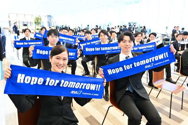 国際線定期便就航への思いを抱いて1982年に入社した芝田社長は「ANAが国際線に進出するためには多くのハードルがあったが、挑戦を支えてくれたのは社内外の仲間だった」と述べ、「突拍子のないことだと諦めず、大きな夢を描いて欲しい。仲間を大切に、互いに尊敬し合う『互尊』の気持ちを持って高め合っていって欲しい」とエールを送った。