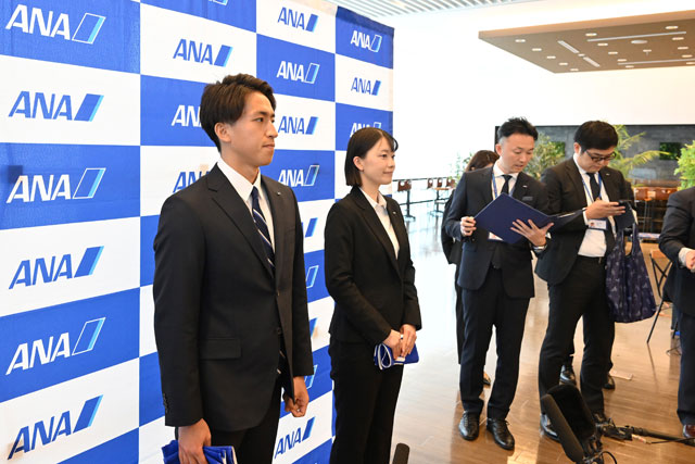 ANAグループの入社式で取材に応じる新入社員代表のANAの山口さん(左)と井上さん=23年4月1日 PHOTO: Tadayuki YOSHIKAWA/Aviation Wire
