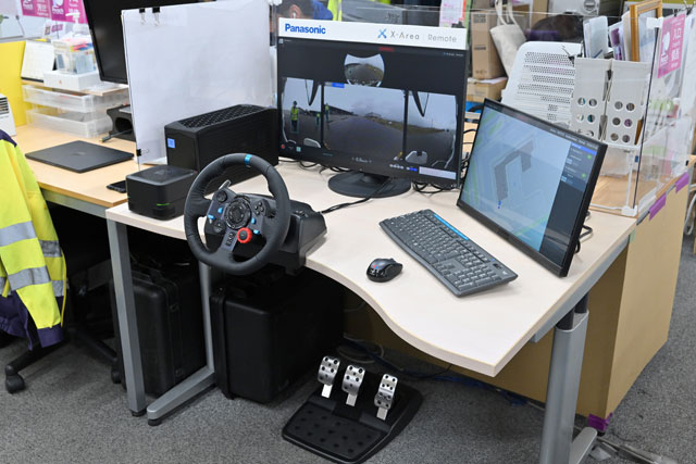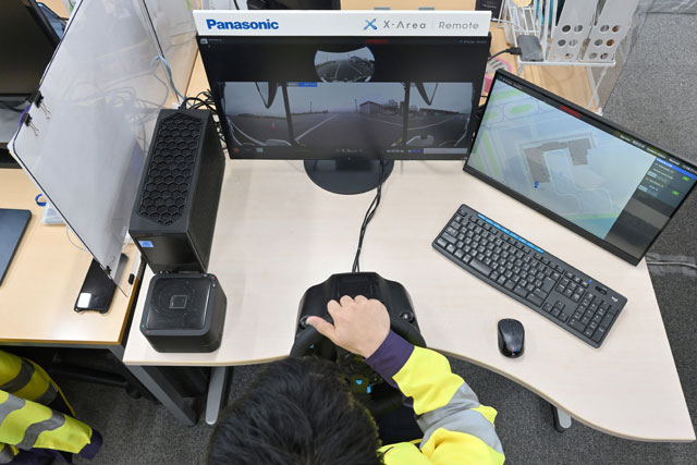 遠隔完成システムはパナソニック ホールディングス(6752)が開発した「X-Area Remote(クロスエリアリモート)」を採用。すでに同社が大阪府の門真・守口地区や神奈川県藤沢市などで実証実験しているもので、今回はTractEasyに同システムを搭載し、遠隔操作するオペレーターが自席に設置されたハンドルやアクセル、ブレーキなどを操作すると、同システムを通じて車両に情報を送信して遠隔操作できるようにした。