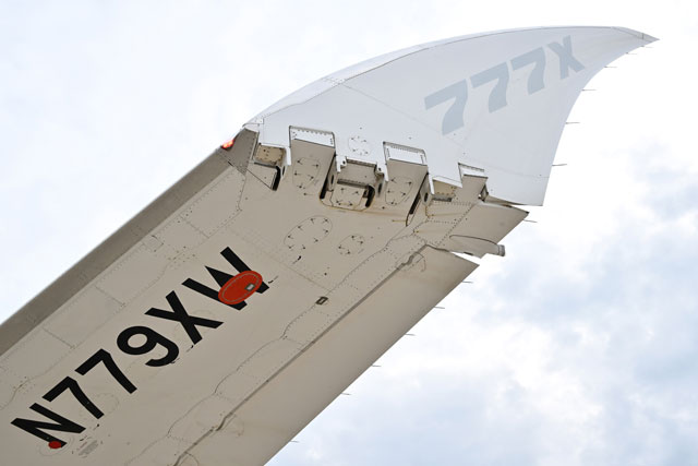 パリ航空ショーで公開された777-9飛行試験機の折りたたみ式の翼端=23年6月18日 PHOTO: Tadayuki YOSHIKAWA/Aviation Wire