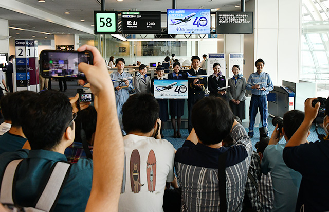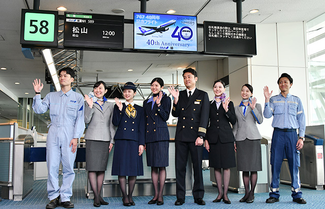 記念フライトの対象便となったのは、正午に羽田を出発する松山行きNH589便。同便が出発した羽田空港第2ターミナルの58番搭乗口付近では、767の機長や就航当時の7代目から現在の10代目まで、歴代制服を着用した客室乗務員4人との撮影スペースを設置した。乗客には記念のストラップとステッカーをプレゼントした。
