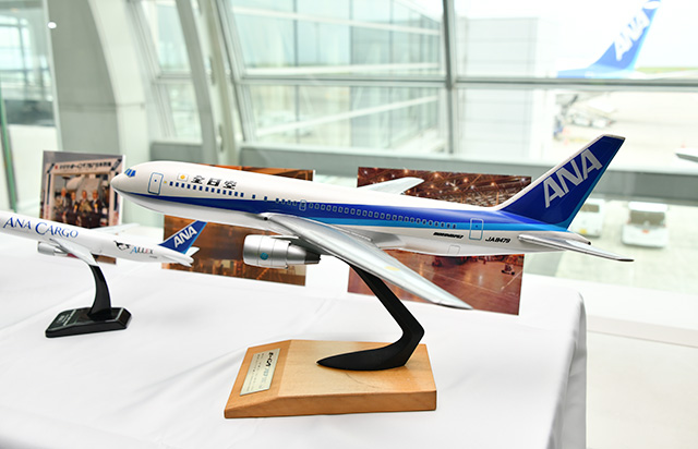 ANAの767就航40周年記念イベントを彩った767-200の同社向け初号機の飛行機模型=23年6月21日 PHOTO: Yusuke KOHASE/Aviation Wire