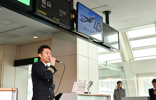 同便の出発前に、767の中里恭洋機長があいさつした。中里機長は767の就航年と同じ1983年生まれ。2011年に副操縦士となり、777のパイロット経験後、2022年に767の機長に昇格した。中里機長は767について「自分の操縦がダイレクトに伝わる飛行機らしい飛行機。自分を鍛えてくれる機体」と表現し、愛着のある姿勢を見せた。