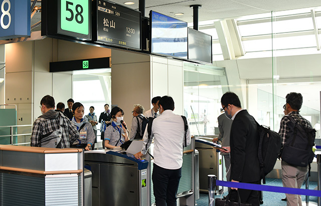 ANAの767就航40周年記念便となった羽田発松山行きNH589便の列に並ぶ乗客=23年6月21日 PHOTO: Yusuke KOHASE/Aviation Wire