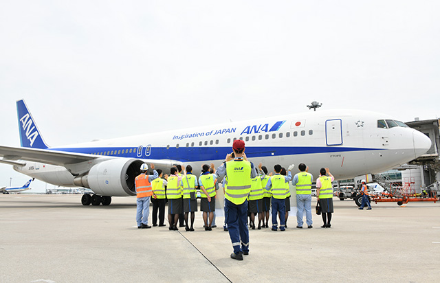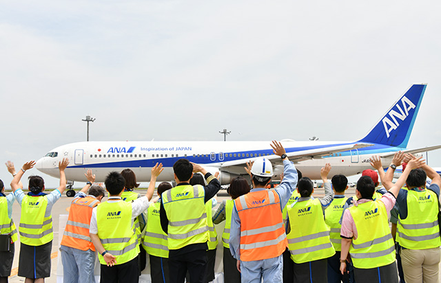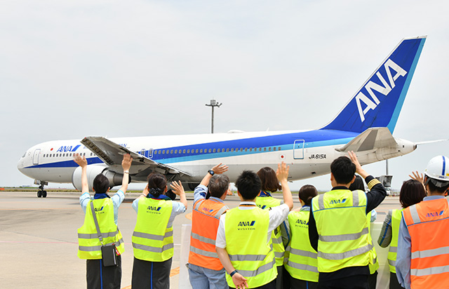 ANAの767就航40周年記念便となった羽田発松山行きNH589便を見送るANAグループ社員=23年6月21日 PHOTO: Yusuke KOHASE/Aviation Wire