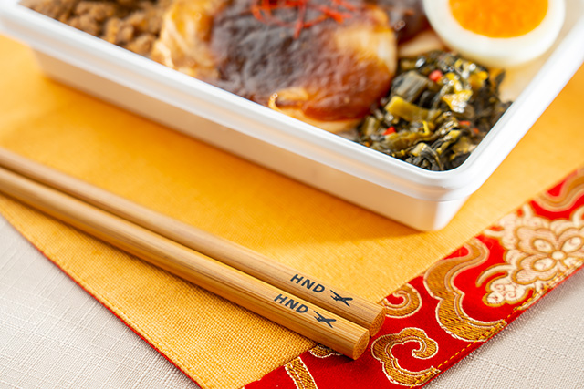 空ビルが通販するコスモ企業の「世界の機内食」新メニュー「よくばり6食セット」でプレゼントするオリジナルの箸(日本空港ビル提供)