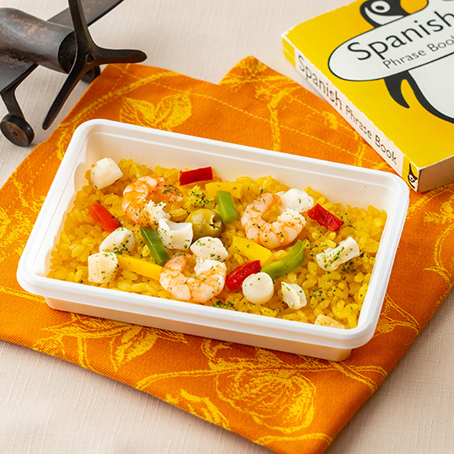 空ビルが通販するコスモ企業の「世界の機内食」新メニュー「パエリア」(日本空港ビル提供)