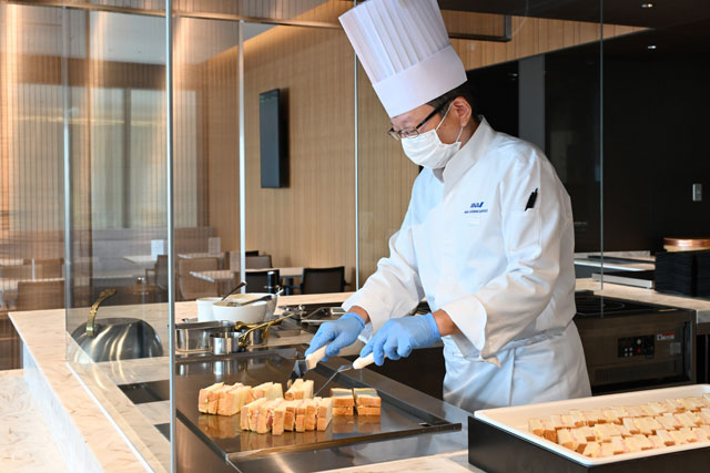 羽田空港第2ターミナル国際線施設のANAスイートラウンジのLIVEキッチンで提供するクロックムッシュ=23年7月13日 PHOTO: Tadayuki YOSHIKAWA/Aviation Wire