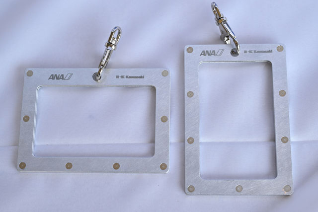 パスケースは、川重が製造する767の端材や余剰材を活用したもので、名刺入れは767と777両機種の製造過程で生じた端材や余剰材を使った。名刺入れは可動式のふたがついており、コックピットにあるランディングギア操作レバーをイメージしたという。