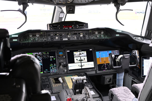 パリ航空ショーで公開された777-9飛行試験機のコックピット=23年6月18日 PHOTO: Tadayuki YOSHIKAWA/Aviation Wire
