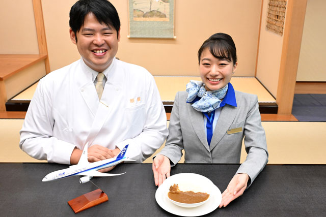 精進料理 醍醐の店内でヴィーガンカレーを紹介する野村祐介料理長(左)とANAの客室乗務員=23年8月17日 PHOTO: Tadayuki YOSHIKAWA/Aviation Wire
