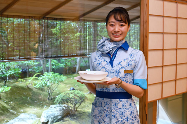 精進料理 醍醐の店内でヴィーガンカレーを手にするANAの客室乗務員=23年8月17日 PHOTO: Tadayuki YOSHIKAWA/Aviation Wire