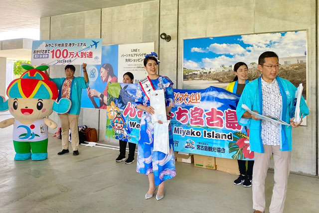 30日は100万人到達を記念し、SAMCOと宮古島市、宮古島観光協会が共同で到着客を対象に歓迎行事を開いた。